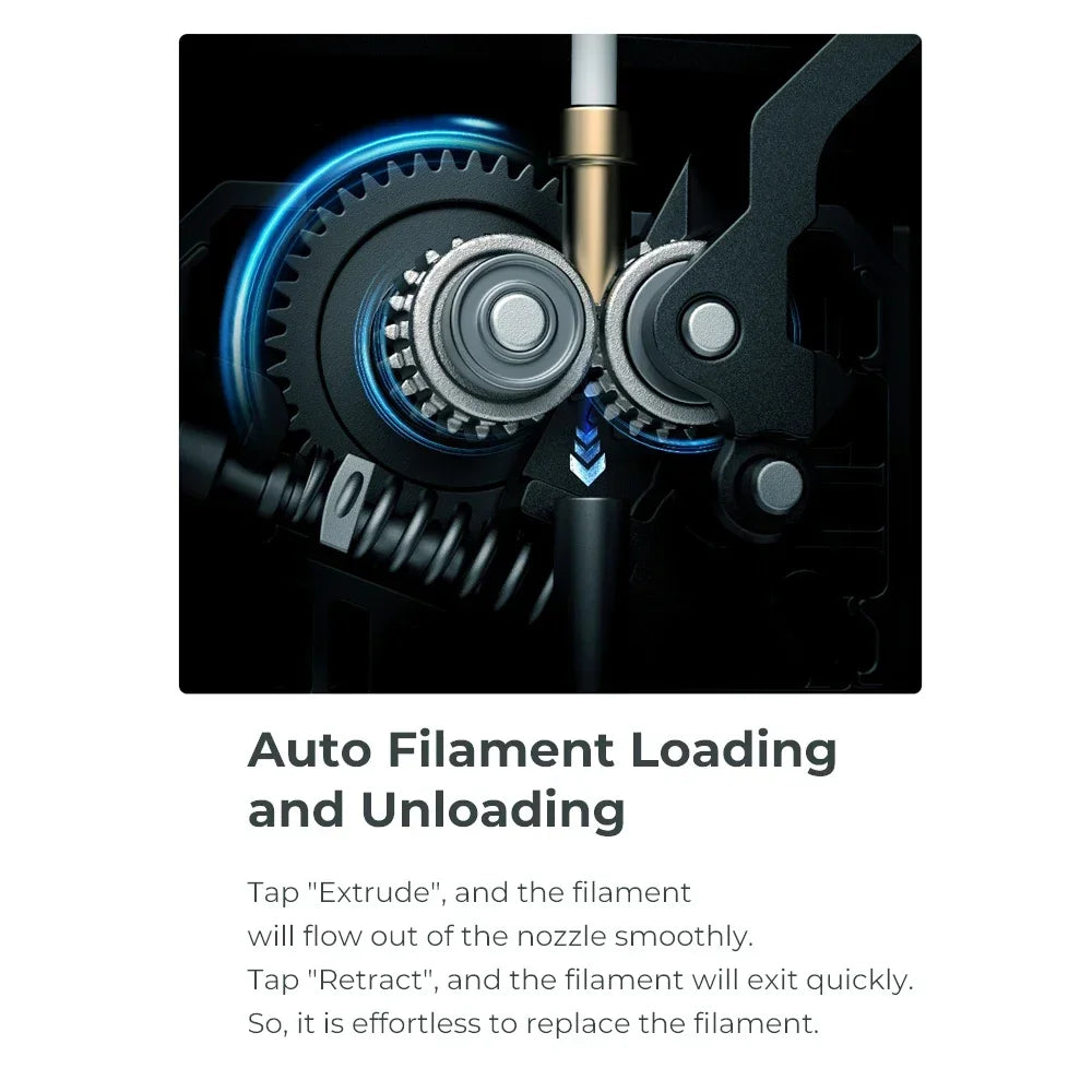 • Extruder Langsung Ganda-Gear: Memberikan kekuatan ekstrusi yang kuat, memastikan pakan filamen yang konsisten dan mengurangi penyumbatan.